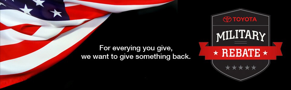 Inspired by your courage and commitment, we are offering a $500 rebate to eligible U.S. military personnel.1 This rebate can be used toward any new Toyota vehicle purchased through your dealer and Toyota Financial Services.